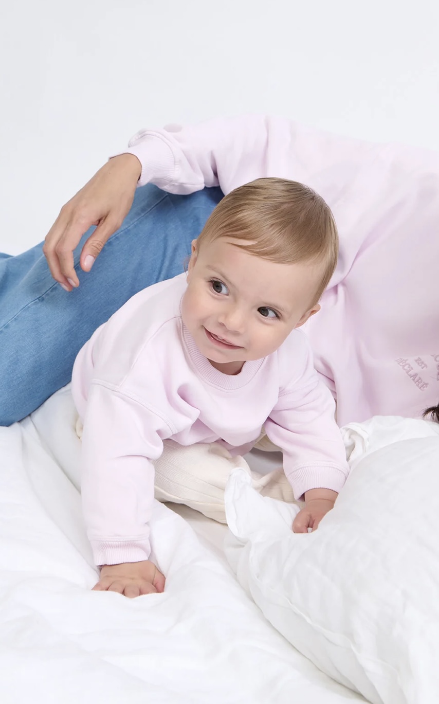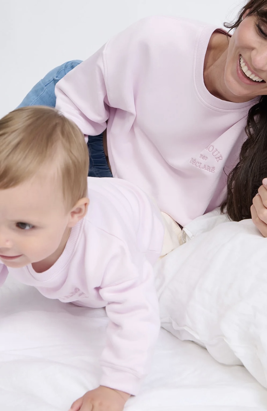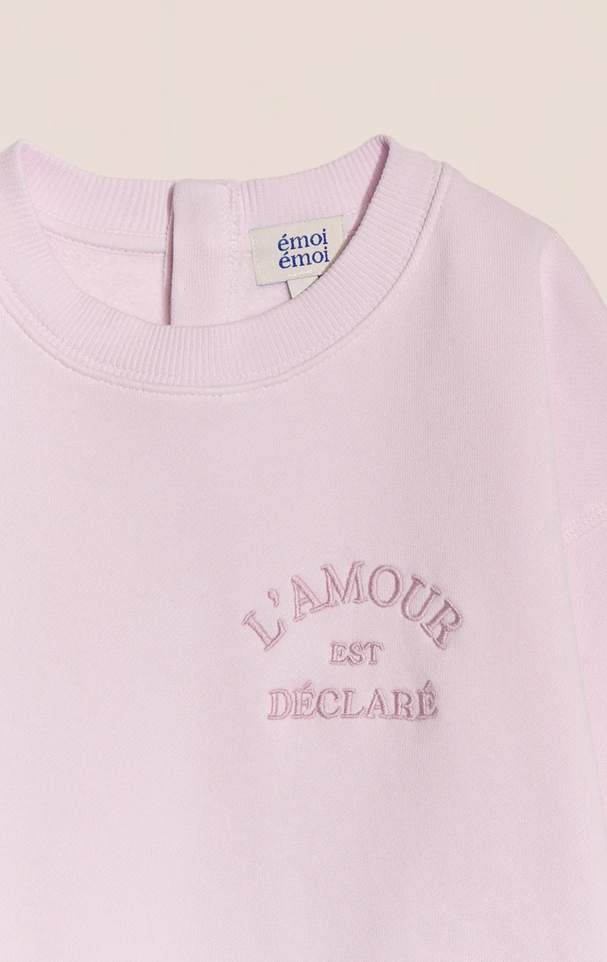 Sweat L’AMOUR EST DECLARE rose version maman et/ ou version bébé/enfant de Emoi Emoi