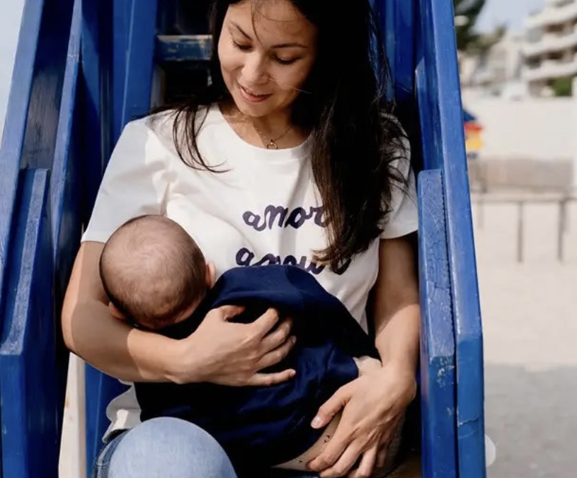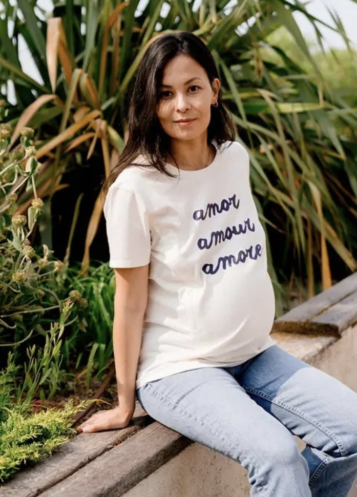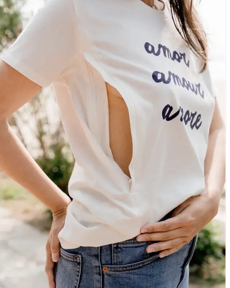 Le t-shirt d’allaitement de couleur crème possède des manches courtes avec impression « Amor, Amour, Amore » en bleu