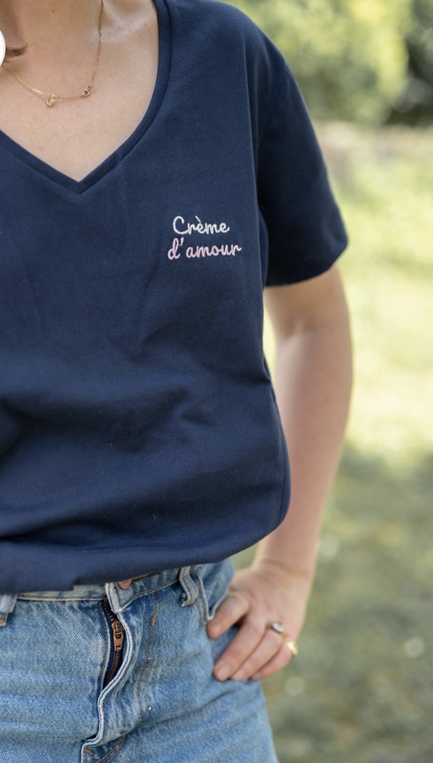 Après le succès du sweat CREME D’AMOUR et le succès de sa jolie broderie, Limky a développé pour vous, une version t-shirt au bleu marine PARFAIT !